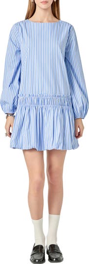 Shirting style comes for dress day in a cotton-forward option fixed with billowed sleeves and finished with a bubbled hem.