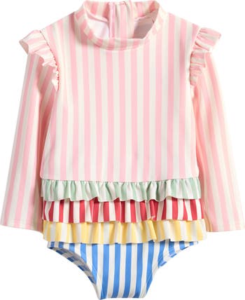Your littlest swimmer will be well-protected in a striped swimsuit offered with full sleeves.