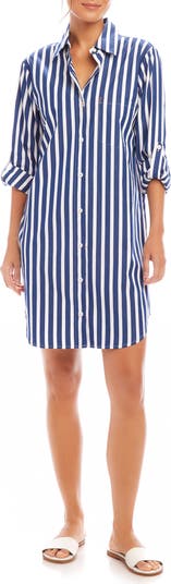 This polished, crisp cotton shirtdress is crafted with classic white and navy stripes and roll-tab cuffs for summery sophistication.