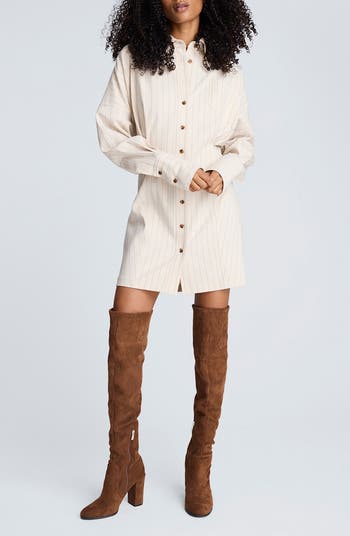 Pin-thin stripes enhance the polish of this crisp shirtdress framed by dropped shoulders and made with a nipped-in waistline.
