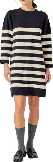 A trio of brassy buttons polishes one shoulder of a striped sweater dress knit in a relaxed fit.