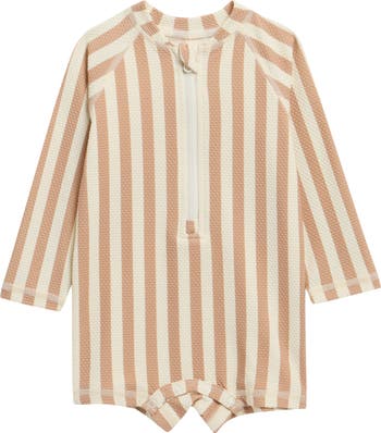 This piqué swimsuit is framed by long sleeves that block out the sun, sand and surf as baby splashes and plays.