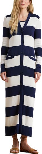 Bold stripes bring a classic look to this longline cardigan fashioned with an easy button front and knit in a maxi silhouette for effortless layering.