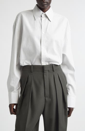 Slender stripes pattern a polished button-up shirt woven from soft Italian cotton in a loose, longline silhouette. An embroidered monogram subtly brands this sophisticated style.