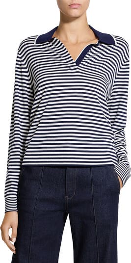 Narrow stripes provide a smart contrast to the solid spread collar of this long-sleeve polo made with soft merino wool.