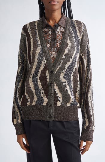 The Italian label's iconic stripes are given a glittering refresh with this twinkling metallic cardigan streaked with softly curving waves.