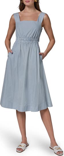 Crisp stripes enhance the carefree charm of this woven A-line midi dress.