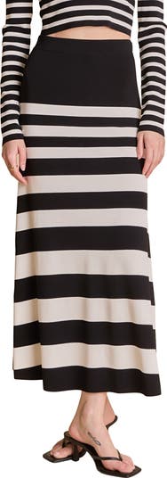 Sassy stripes wrap a flowy, midi-length sweater-skirt made from a lightweight knit and fashioned with a smooth fit over the hips.