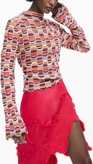 Textured stitching creates a groovy throwback look in a mock-neck sweater framed by flared sleeves that further the '60s vibe.