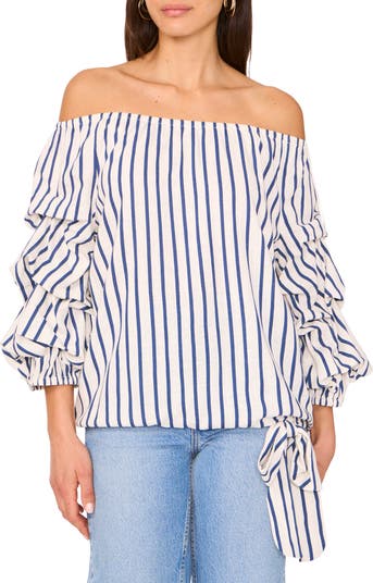 Stripe Off the Shoulder Linen Blend Bubble Sleeve Top