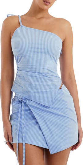 An asymmetric neck and hem frame this one-shoulder top softened by delicate ties and stretchy, striped fabric.
