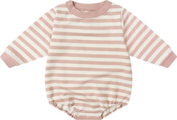 Soft pink stripes pattern a long-sleeve bubble romper cut from a stretchy organic cotton knit with snaps between the legs for easy changing.