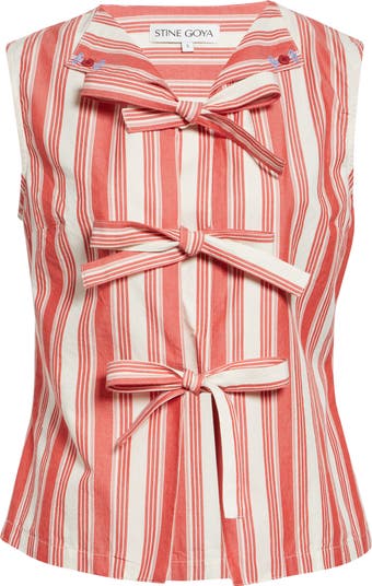 Delicate embroidery plays at the collar edges of this organic-cotton vest highlighted by bright stripes so it stands out at day and evening events.
