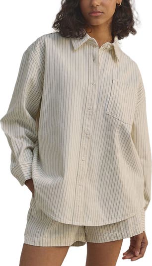 Pinstripes bring a menswear-inspired vibe to this oversized button-up shirt made of breathable cotton.