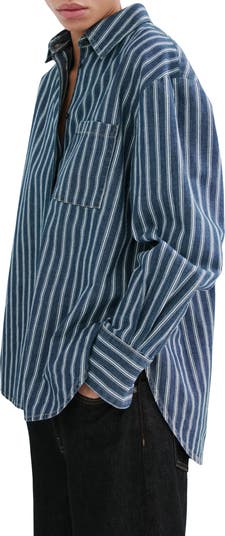 An oversized silhouette furthers the relaxed, retro vibe of this nonstretch-denim shirt patterned with impeccable stripes.