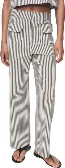 Yarn-dyed stripes rain down the straight-leg silhouette of these pants cut from stretchy cotton-enriched fabric.