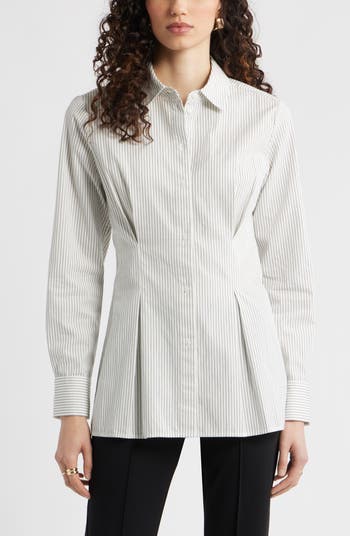 Crisp pleats nip in the waist to give this striped button-up a dramatic new riff on the classic style.