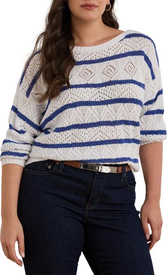 Geometric pointelle stitching lightens the look and feel of a summery, nicely draped sweater featuring bold stripes and a relaxed fit.
