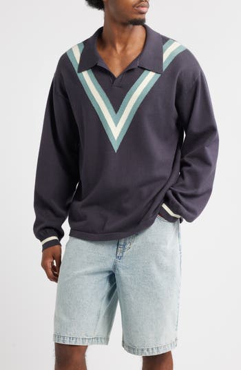 A classic Johnny collar and V-shaped stripes enhance the sporty good looks of a polo sweater knit in a roomy, comfortable fit.