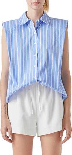 Variegated stripes and padded shoulders polish a sleeveless button-up shirt cut from a crisp cotton blend in a comfortably relaxed fit.