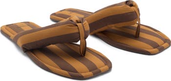 Well-padded and delightfully puffy, this flip-flop wrapped in striped cotton canvas brings exceptional comfort to any sunny-day outing or lazy day indoors. Its plumped-up construction makes it a great where-did-you-get-those conversation starter, while its soft feel and generous cushioning make every step feel like a hug from a friend.