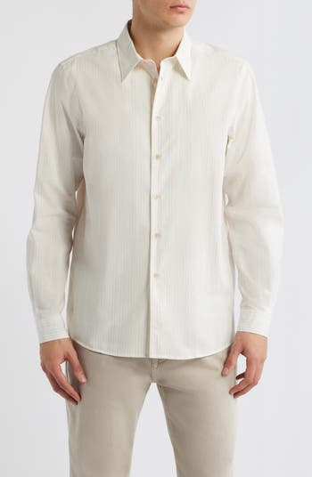Cool cotton patterned in faint stripes makes an everyday favorite of a shirt that's topped with a spread collar to keep you looking smart when you're feeling casual.