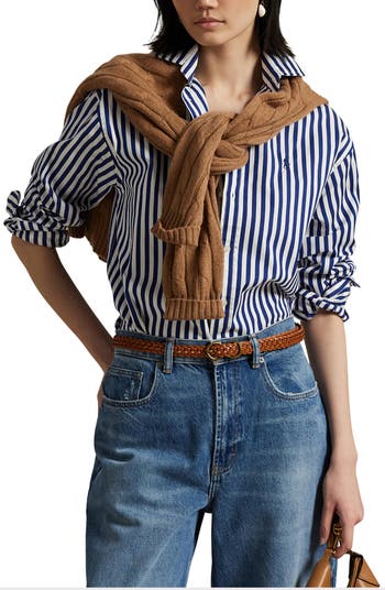 The label's timeless polish shines through the vertical stripes of a crisp cotton-poplin button-up cut in a breezy, relaxed silhouette.