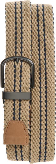 Intricately woven elastic cording makes it easy to cinch the perfect fit in a belt patterned in slim stripes and designed to reverse from khaki to navy for easy versatility. The curved pin buckle adds a gleaming finish to the everyday appeal.