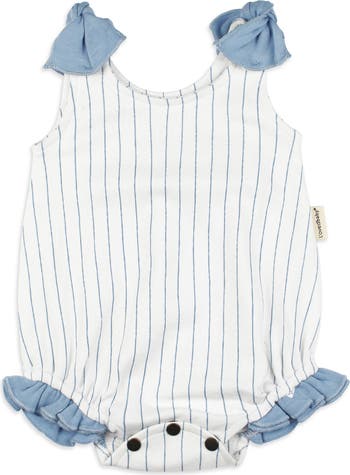 Pinstripes run up and down a sweetly ruffled bubble romper that's made from organic cotton for breezy comfort. Bow-tied straps add to the cuteness, while a trio of snaps makes for easy changes.