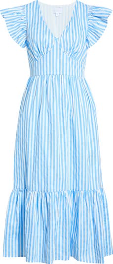 Shades of sea and sky stripe a sunny-day dress finished with a wide ruffle and cut from pure cotton.