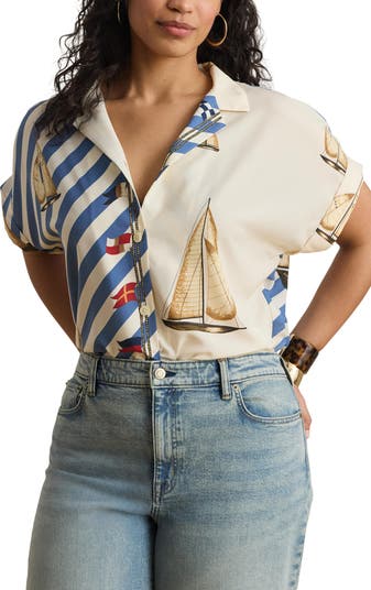 Cut from lightweight crêpe de chine, this dolman-sleeve camp shirt celebrates Ralph Lauren’s nautical-inspired sensibility with a pattern-blocked motif of stripes, sailboats and sailing flags.