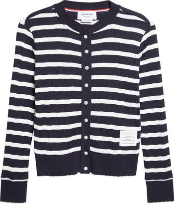 Scalloped trim softens the preppy vibe of this striped cardigan rendered in supersoft cotton rib. The front hem bears Browne’s signature uniform tag, and a hint of tricolor trim slips out at the inner collar.