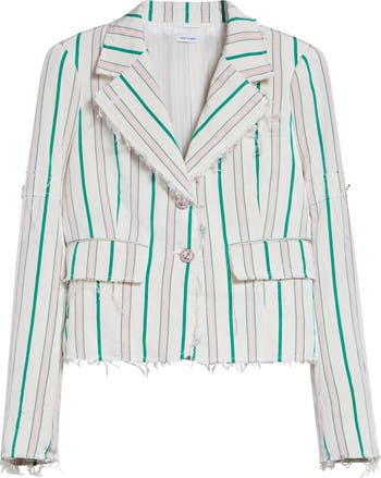 Frayed raw edges outline the details of this pink-and-green striped jacket crafted in Italy from a blend of silk and cotton. Signature armbands and the front closure display charming pink enamel anchor buttons for a prep-inspired touch.