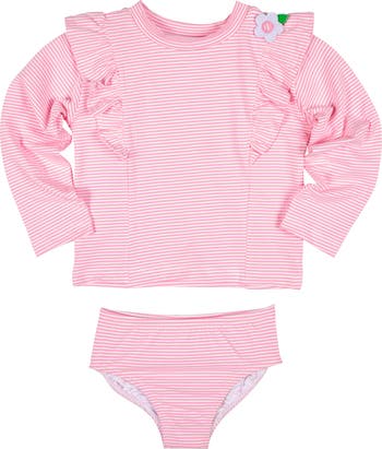 Pretty and practical for sunny days by the water, this rashguard swimsuit combines pink and white stripe seersucker swim fabric with soft solid pink tricot for comfortable stretch and coverage. A cheerful appliqué flower and playful front ruffle add sweet, feminine detail to the sporty silhouette. Designed to move with her, shirred back legs help keep the suit securely in place during swimming and play—making it perfect for beach days, pool time, and warm-weather vacations.