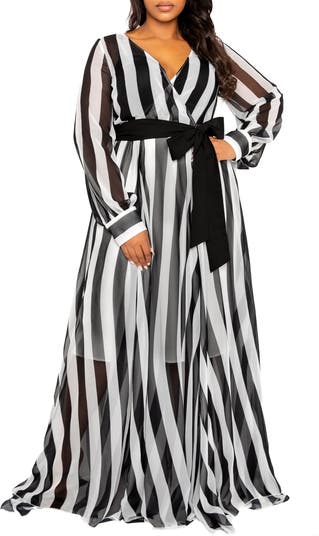 Sheer long sleeves frame a billowy faux-wrap maxi dress completed by a posh tie belt and a floor-sweeping skirt.