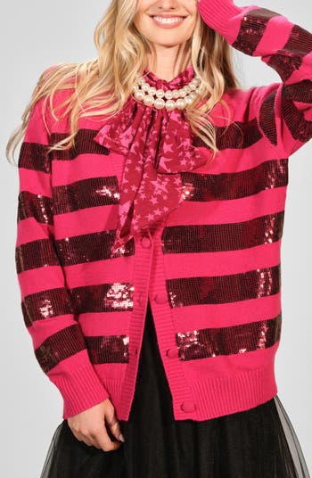 Lustrous sequin stripes add dazzling allure to a relaxed woolly cardigan anchored by ribbed trim.