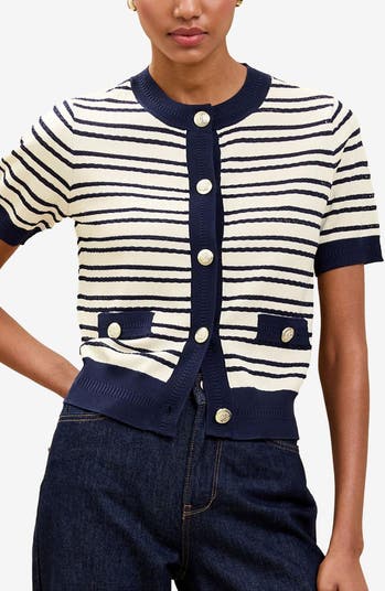 Polish your everyday look in a striped short-sleeve cardigan textured with mixed pointelle stitching and finished with silvertone crest buttons.
