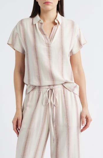 Vertical stripes bring easy polish to this linen-enriched popover top finished with a relaxed spread collar and breezy short sleeves.