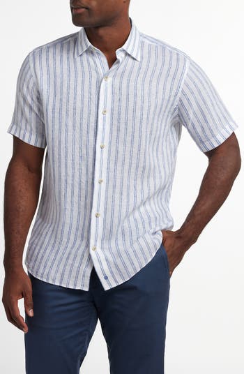 David Donahue Stripe Short Sleeve Slub Linen Button-Up Shirt, Alternate, color, White/ Blue