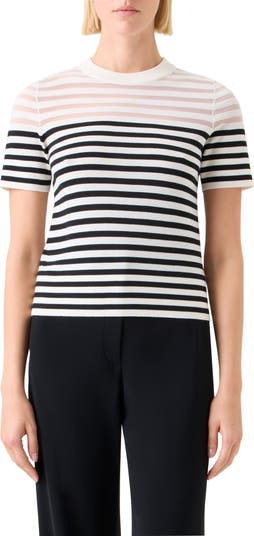 Deceptively simple in its composition, this short-sleeve sweater juxtaposes delicate sheer accents with bold, high-contrast stripes, all rendered in a luxurious wool blend that embodies the Swiss label's signature refined minimalism.