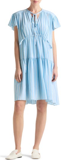Keep your warm-weather look polished in this striped shift dress crafted of silk crepe de Chine in a relaxed drawstring-gathered silhouette with flounced hem.