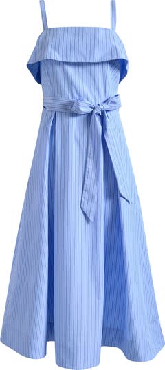 Crisp stripes further the carefree yet sophisticated style of this woven cotton dress featuring a ruffle-trimmed neckline and matching tie belt.