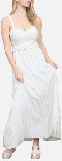 Channel carefree, classic style in this subtly striped sleeveless dress cinched with a matching belt for added structure.