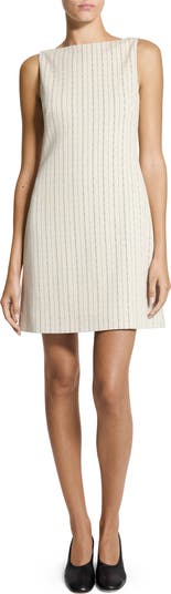 Curved seams create the figure-enhancing silhouette of this sleeveless minidress patterned with slim vertical stripes.