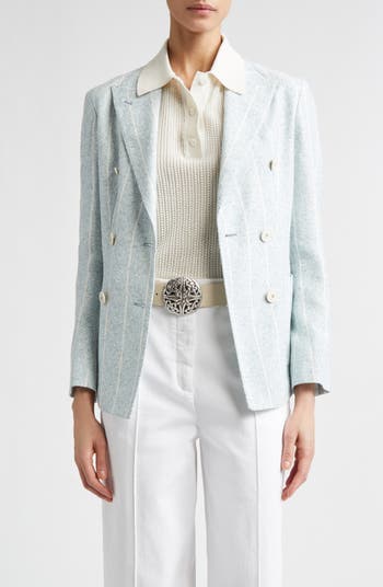 Light pinstripes accentuate the highly slubbed texture of this double-breasted jacket tailored with wide lapels from an elegant linen-blend twill.