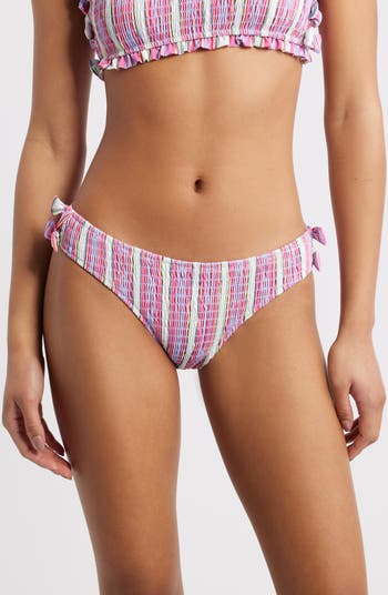 Sweeten your sunny-day vibe in these bow-detailed bikini bottoms fashioned with scrunched smocking, summery stripes and the brand's logo embroidered at the back.