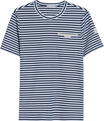 Leather accents on the sleeve and chest pocket elevate a classic short-sleeve T-shirt cut from soft stretch cotton, patterned in timeless, marine-inspired stripes.