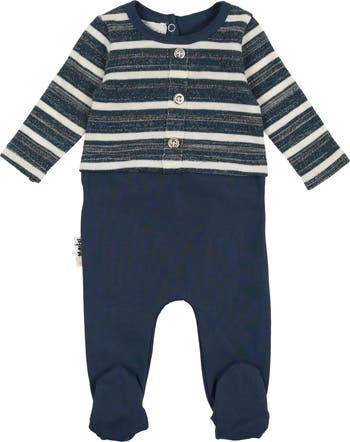 A striped bodice with a nonfunctional button placket gives a two-piece look to this soft and cozy cotton-rich sweater-footie