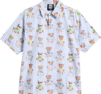 A repeat teddy bear motif brings nostalgic charm to this short-sleeve cotton button-up shirt finished with a classic point collar.