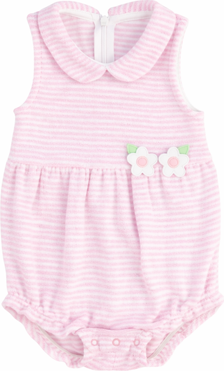 Soft, cozy, and perfect for warm-weather play, this romper is crafted from pink and white stripe terry cloth in a comfortable cotton blend. Cheerful appliqué flowers add a sweet touch, making it a charming choice for beach days, poolside lounging, and relaxed vacation moments. Designed with a snap inseam for easy changes and a back zipper for simple dressing, it’s an effortless one-piece for conveniently transitioning from pool to playtime.